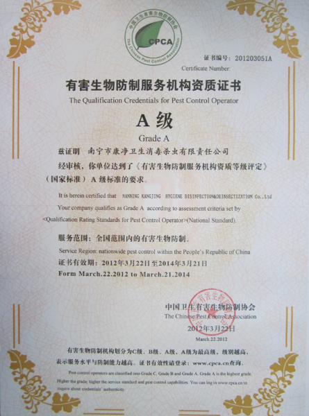 2012年3月21日-24日,中國衛(wèi)生有害生物防制協(xié)會2012年年會暨第四屆三次理事會在六朝古都南京市隆重召開,康凈公司被授予“中國有害生物防制服務機構資質(zhì)A級證書”。年會是我國有害生物防制行業(yè)界最具規(guī)模與影響力的年度盛會,屆時,全國協(xié)會及會員單位、外國協(xié)會、省市地方協(xié)會(港臺協(xié)會)、愛衛(wèi)系統(tǒng)、疾控系統(tǒng)、科研院校、藥械生產(chǎn)與經(jīng)營企業(yè)、PCO企業(yè)等有關人士齊聚一堂,本次會議以“除四害與愛國衛(wèi)生運動——紀念愛國衛(wèi)生運動開展60周年”為主題,并對2011年通過A級資質(zhì)考評的全國10家PCO公司正式頒發(fā)資質(zhì)證書。圖為(中國衛(wèi)生有害生物防制協(xié)會)秘書長楊華林先生、(歐洲有害生物管理業(yè)協(xié)會)總干事Rob Fryatt 先生作報告,及頒發(fā)證書現(xiàn)場。
